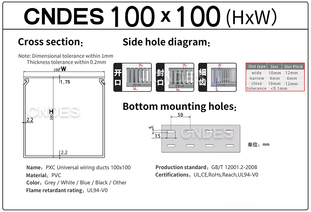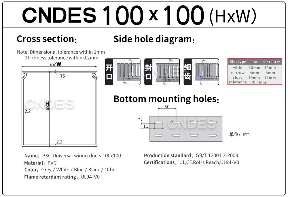 Optimizirajte svoje projekte kabliranja z našimi prilagojenimi kabelskimi kanali 100×100 za upravljanje žic. Kot vodilni proizvajalec in dobavitelj PVC kabelskih polic na Kitajskem, CNDES zagotavlja zanesljive, visoko natančne in prilagodljive rešitve za vse vaše potrebe upravljanja kablov. Imamo vse specifikacije za žične kanale (kabelske police). Če potrebujete druge specifikacije, vas prosimo, da nas kontaktirate!