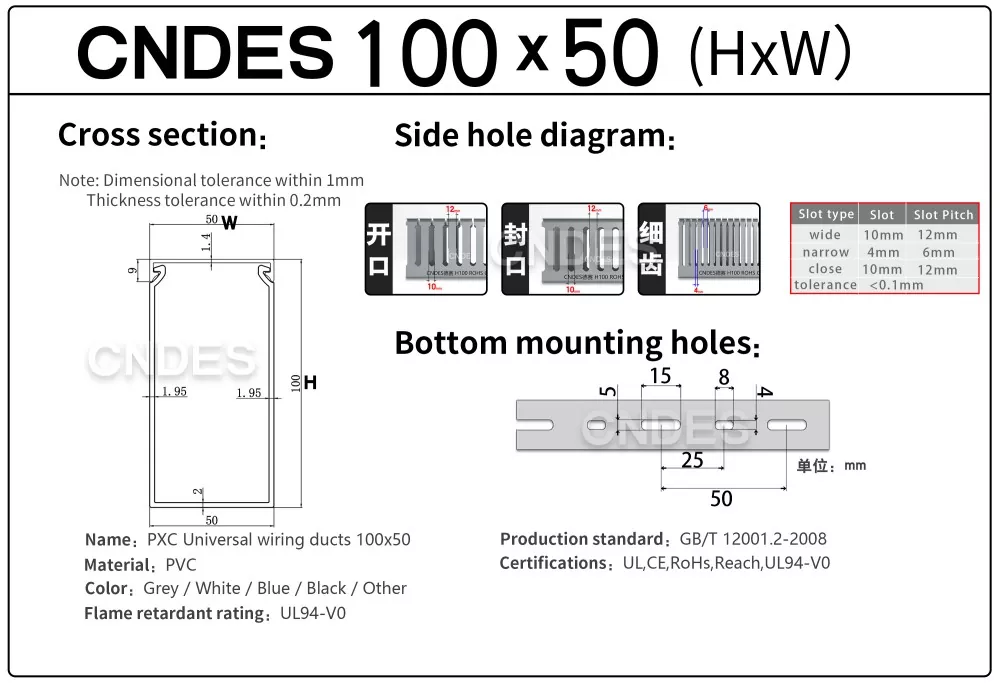 CNDES je profesionalni proizvajalec kabelskih palic s 24-letnimi izkušnjami, specializiran za proizvodnjo prilagojenih 100 mm višine odprtih rež iz PVC ohišij za ožičenje. Tukaj bomo predstavili naše 100 mm visoke kabelske police.