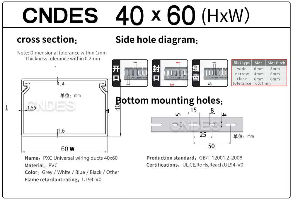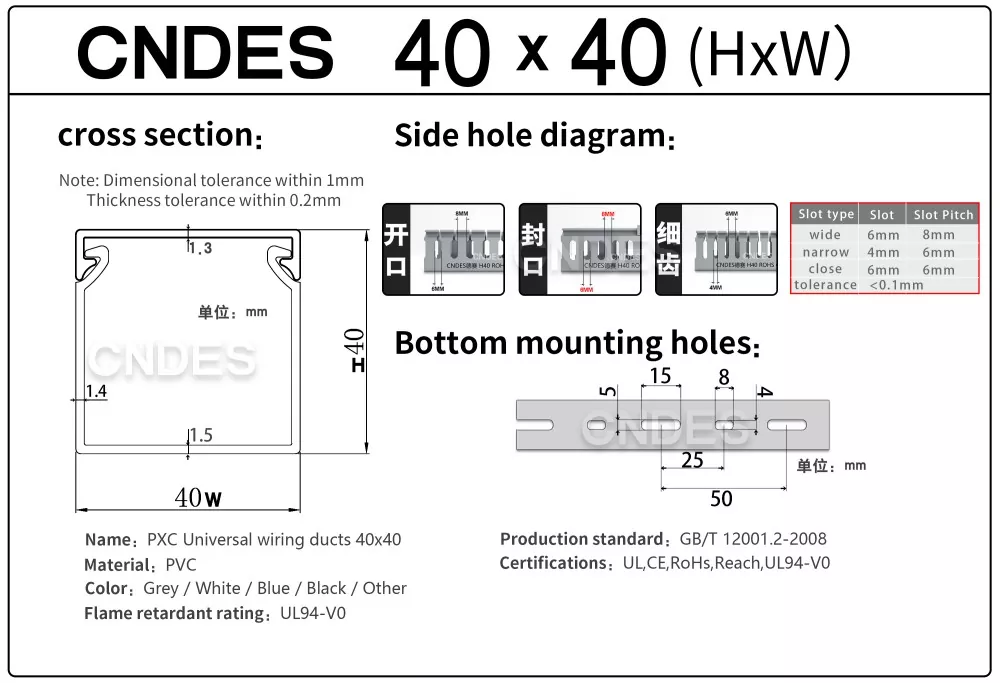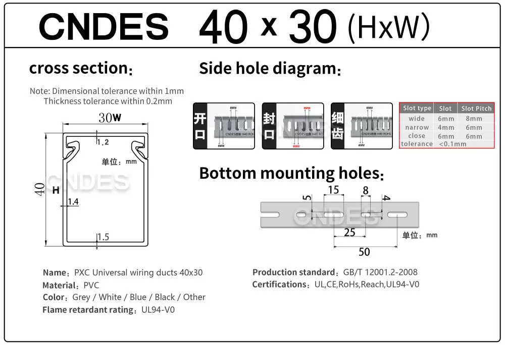 Če za svoj naslednji projekt iščete zanesljiv visoko zmogljiv PVC kanal za ožičenje z režami višine 40 mm, je CNDES tu, da vam pomaga. Nudimo prilagajanje, hitro dostavo in neposredno tovarniško določanje cen, kar olajša pridobivanje točno tistega izdelka, ki ga potrebujete.