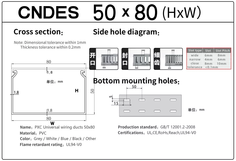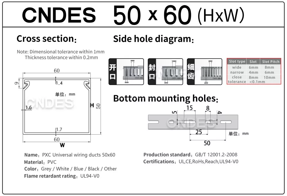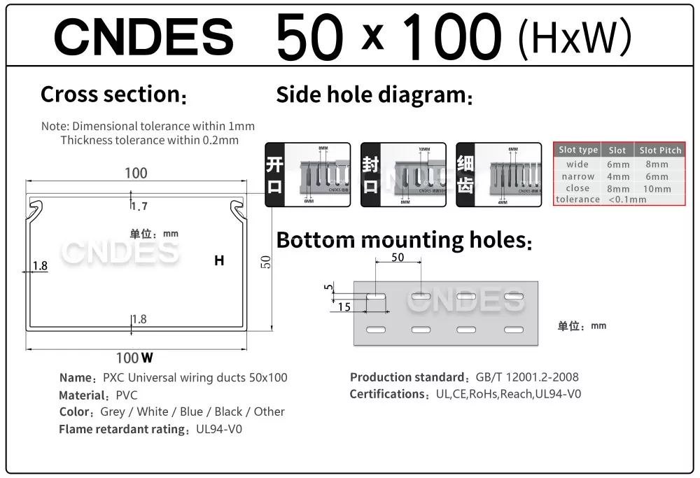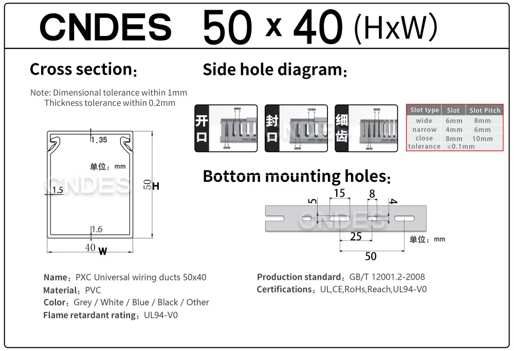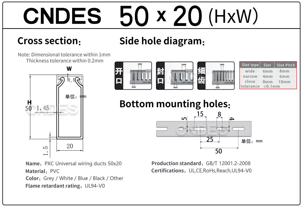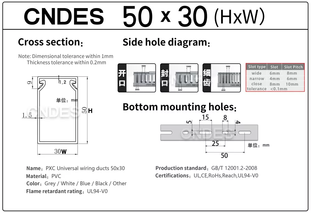 CNDES je proizvajalec in dobavitelj, specializiran za dobavo žičnih kanalov za PVC plošče z režami. Tukaj bomo predstavili naše 50 mm visoke kanale za ožičenje, vključno z naslednjimi specifikacijami: 50*20,50*25,50*30,50*35,50*40,50*45,50*50,50*55,50*60,50*80,50*100.