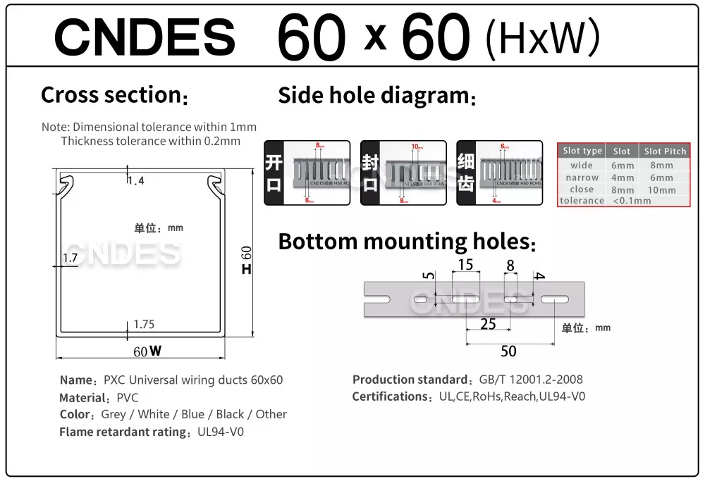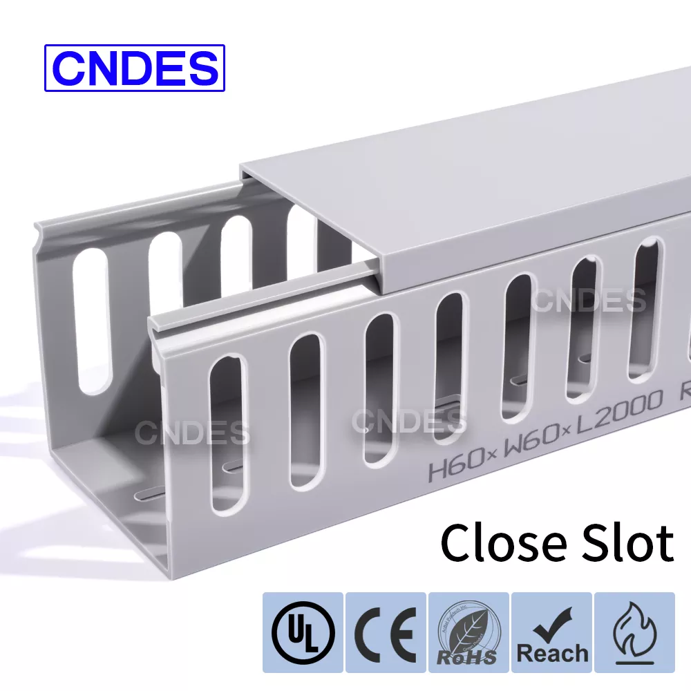 CNDES-ov kabelski kanal za nadzorno omarico je izdelan iz lastniške formule PVC. PVC krmilna omarica z režami je okolju prijazna, negorljiva in odporna na udarce ter lahko prenese večkratno upogibanje za 180°, ne da bi se zlomila.