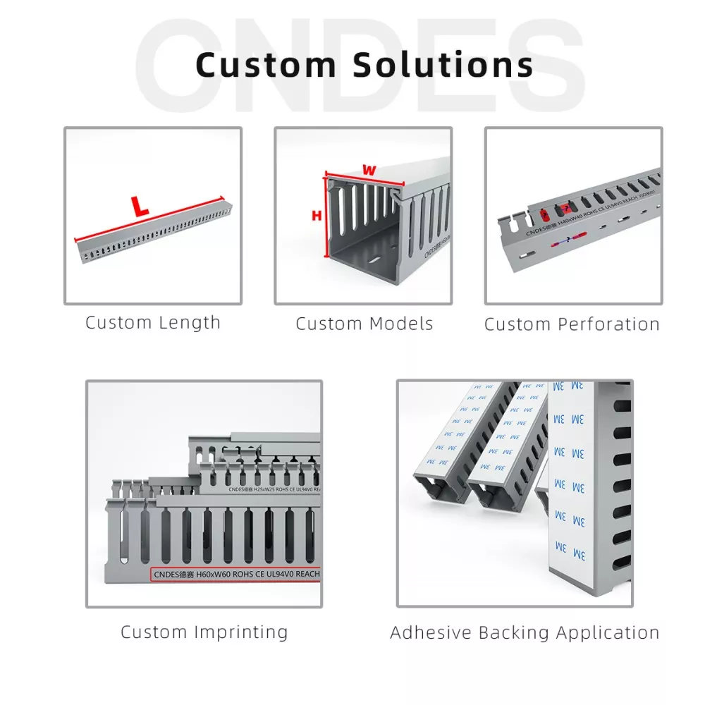 Pri CNDES nudimo celovito prilagajanje kanalov za ožičenje. Naše storitve segajo od specializiranih funkcionalnih lastnosti (antistatične, UV-odporne, enostavne za zlom) in popolnih prilagoditev dimenzij (dolžina, višina, širina, položaj luknje/profil/naklon) do estetskih možnosti blagovne znamke (barve po meri, logotip, tiskanje besedila). Nudimo tudi lepilno podlago.