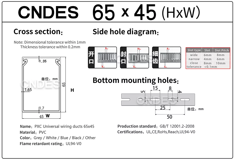 Če nabavljate prilagojene sive PVC kanale za ožičenje z režami 65 × 45 pri zanesljivem proizvajalcu in dobavitelju na Kitajskem, CNDES ponuja dosledno kakovost, prilagodljivo prilagajanje in profesionalne storitve.