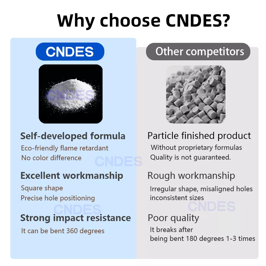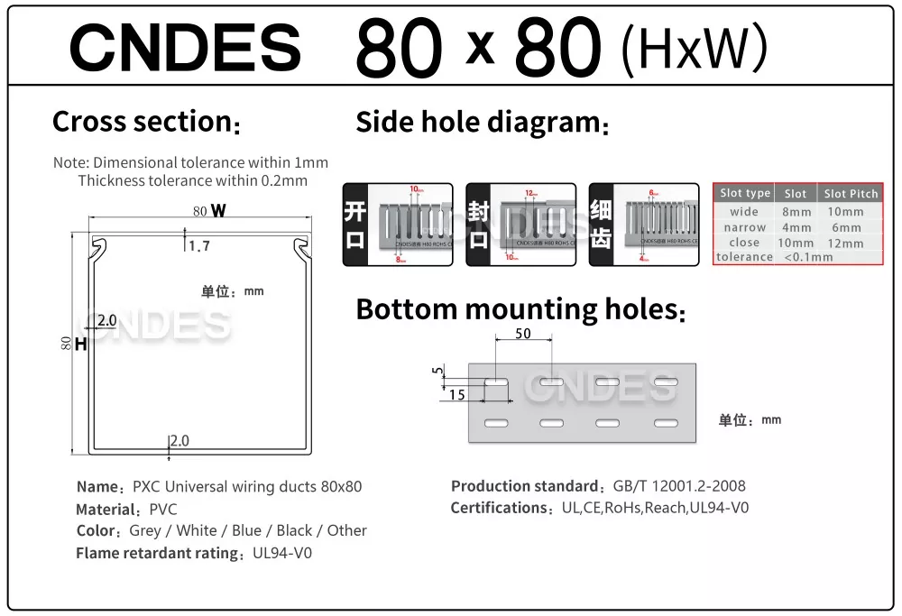Ko standardni kabelski nosilci ne sprejmejo zapletenih kabelskih snopov, je CNDES prilagojen PVC stikalni kabelski kanal z režami 80 × 80 vaša dobra izbira. Z velikim notranjim prostorom 80 mm * 80 mm je posebej zasnovan za scenarije z velikimi zahtevami, kot so hrbtenični kabli podatkovnega centra, napajalne gruče industrijske opreme in centralizirano ožičenje v velikih krmilnih omaricah. Z lahkoto sprejme in organizira veliko število kablov ter se enkrat za vselej poslovi od nereda in zastojev.